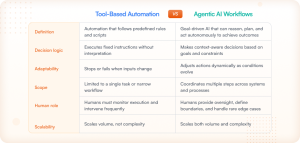 Core differences between tool-based automation and agentic AI workflows